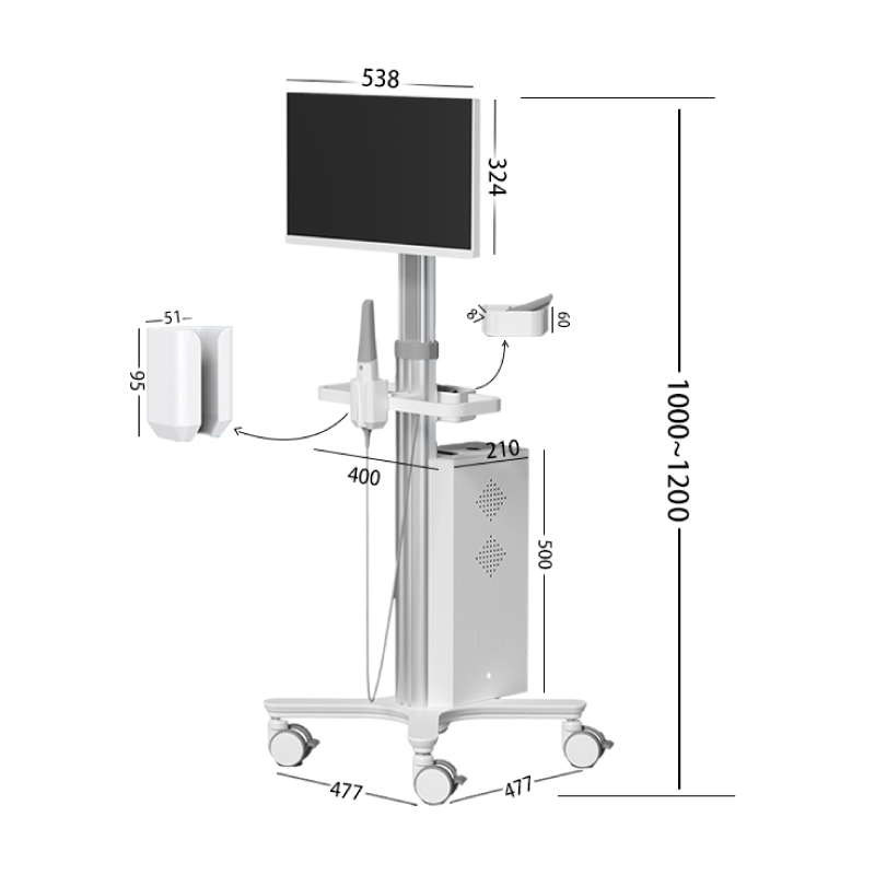 これは、完全に統合されたモバイル歯科用口腔内スキャナーシステムです。調整可能なアームに取り付けられた高解像度タッチスクリーンモニター、コンパクトなスキャナーハンドピース、そしてロック可能な車輪を備えた頑丈なカートを備えており、院内での移動を容易にし、デジタル印象ワークフローを強化します。
