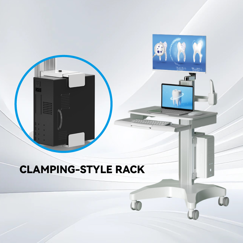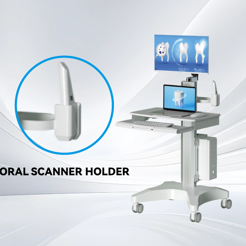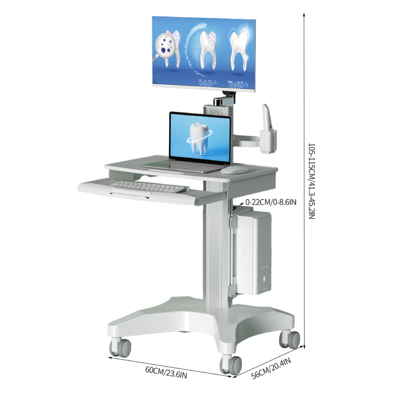 調整可能なモニター、一体型CPUマウント、引き出し式キーボードトレイ、そして安全な口腔スキャナーホルダーを備えた、洗練されたオールインワンの歯科用ワークステーション。臨床現場における機動性と効率性を追求して設計されています。