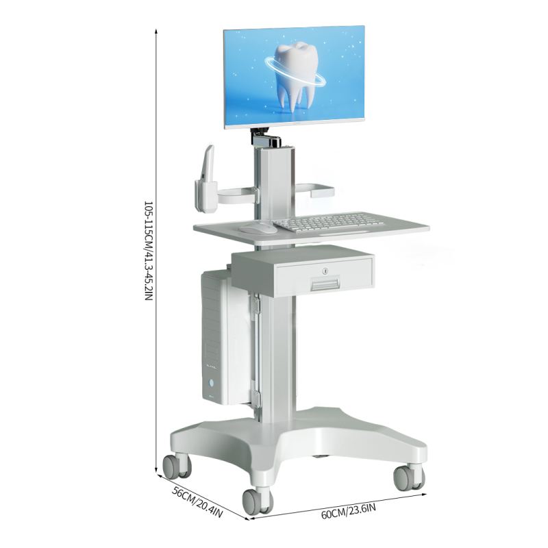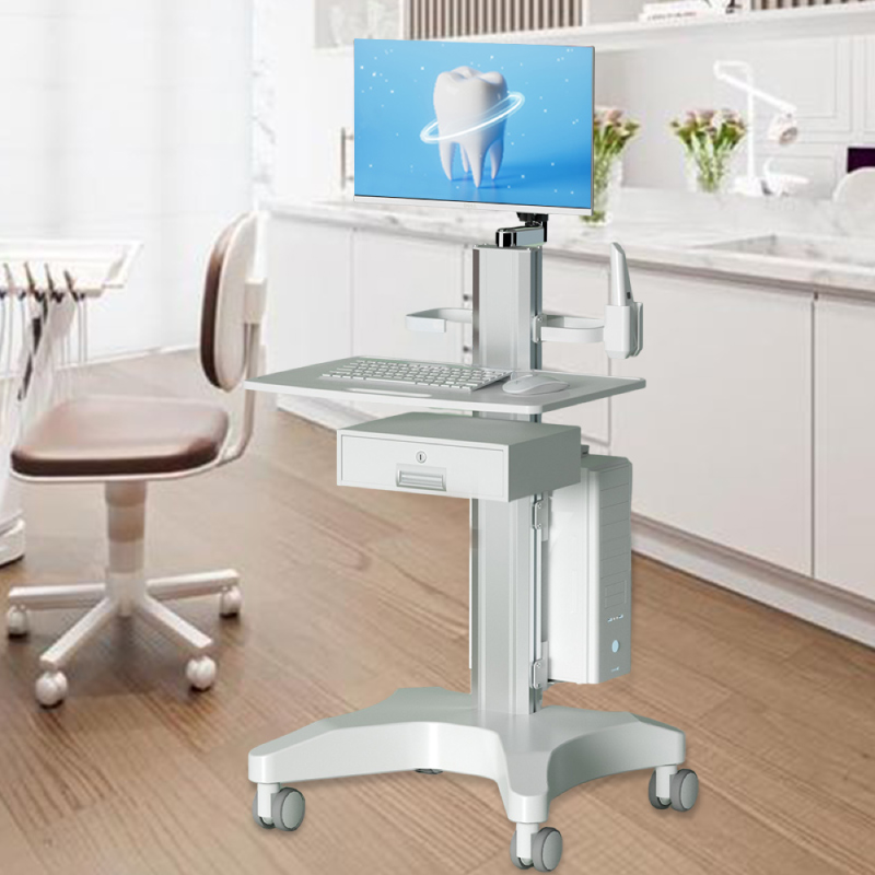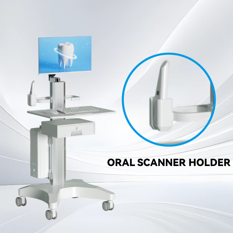 このオールインワンのデンタルカートは、PCワークステーション、3Dスキャン用の調整可能なモニター、そして安全な口腔スキャナーホルダーを一体化しています。引き出し式のキーボードトレイとロック付きの引き出しを備え、整理された収納スペースを確保し、効率的でモバイルな臨床ワークフローを実現します。