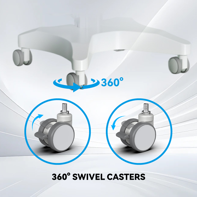 Tこれらの頑丈なキャスターは、スムーズで多方向への移動を可能にし、機器の位置決めを容易にします。シンプルなステップロック機構により、車輪はしっかりと固定され、処置中の安定性を確保します。スムーズな移動と確実なロックの両方が求められる医療・歯科用カートに最適です。