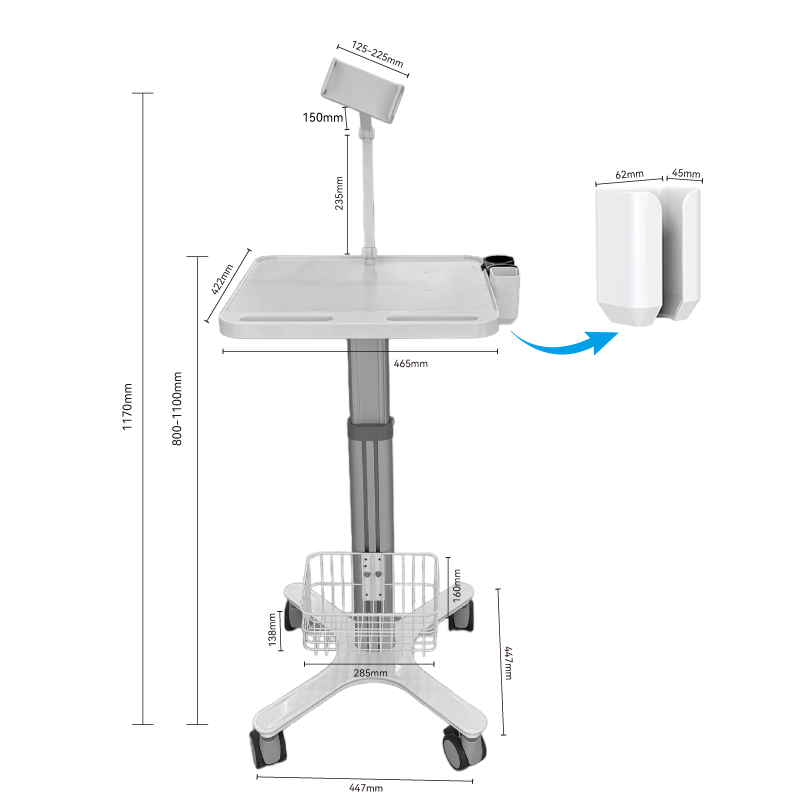 このカートには、透明な格子状のデザインを採用した視認性の高い収納バスケットが装備されており、内部の物品が一目で確認できるため、素早く簡単にアクセスできます。大容量のバスケットには、医療用品、付属品、その他の物品を収納・整理でき、作業スペースをすっきりと保つことができるため、医療スタッフは必要な物品を迅速に取り出すことができ、臨床効率の向上につながります。