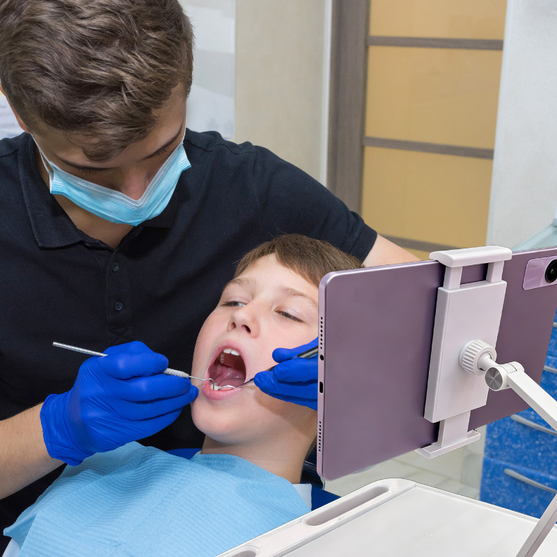 この携帯電話・タブレットホルダーは、スマートフォンやタブレットとの互換性を考慮した調整可能なクランプ設計を採用しており、歯科医院における多様な使用ニーズに対応するために追加のアクセサリーは不要です。多関節可動式メカニカルアームは360°回転と自由なピッチ角調整が可能で、医師は口腔内スキャン画像をリアルタイムで表示し、患者とのスムーズなコミュニケーションを図るために画面角度をカスタマイズできます。高強度滑り止めクランプアームとノブ式ロック機構により、角度調整やカートの移動中でもデバイスの滑りを防ぎ、安全で安定したグリップを実現します。人間工学に基づいた昇降構造により、快適な操作姿勢を維持し、長時間のスキャン作業中の疲労を軽減します。歯科臨床現場向けに特別に設計されており、歯科診療の習慣に完璧に適合し、口腔内スキャンデータを鮮明に表示することで、デジタル診断と治療の効率を高めます。