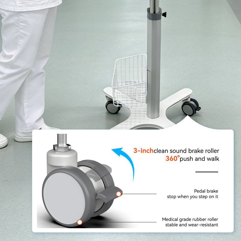 このカートには、360度柔軟に回転し、フットブレーキでしっかりとロックできる、高品質な3インチ医療用静音ユニバーサルホイールが4個装備されています。患者の邪魔をすることなく静かに移動できる耐摩耗性ゴム製ホイールは、クリニックの床を保護し、部屋間のスムーズな移動を可能にします。安定したロック機構により、治療中の安全な操作が保証され、変化の多い臨床環境に最適です。