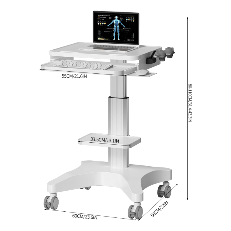 この洗練された医療用カートは、高さ調節可能なデザインと、解剖学的データを表示できるノートパソコンを内蔵しています。一体型のキーボードトレイとスムーズなキャスターにより、臨床現場における効率的なPOCワークフローをサポートします。