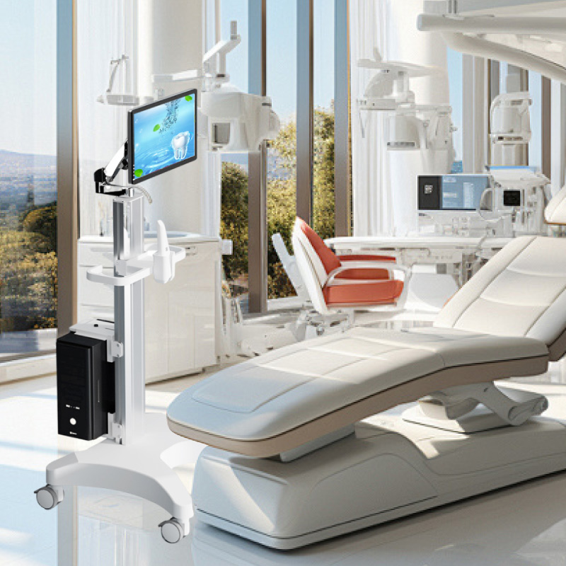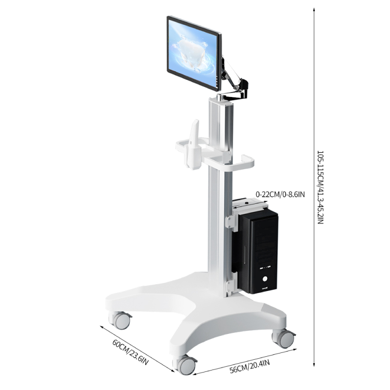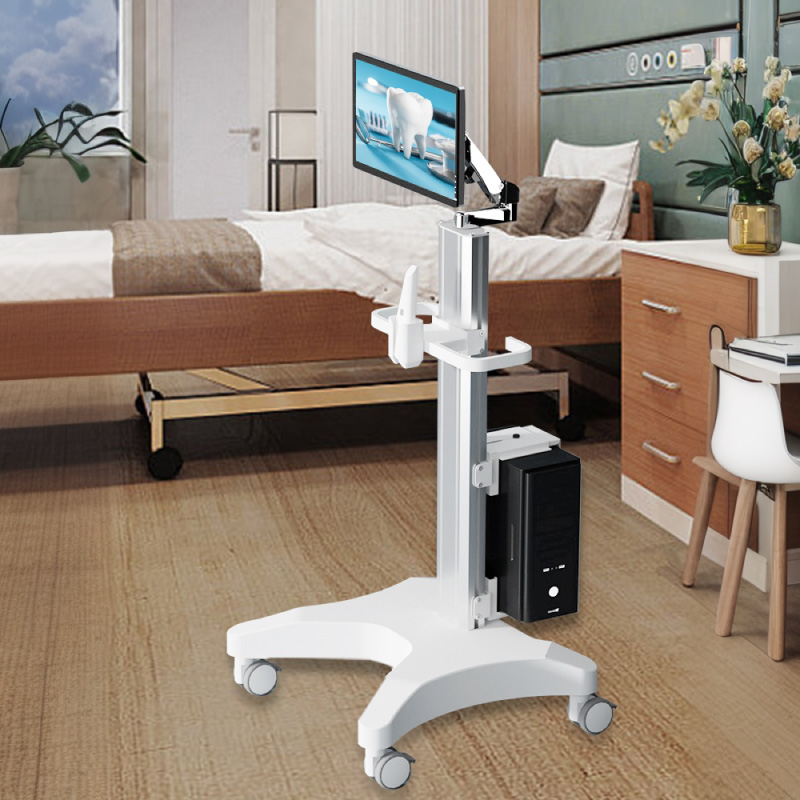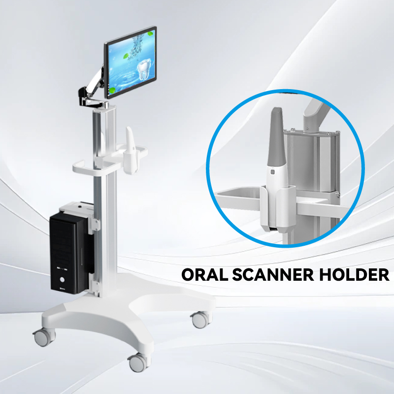 空気圧式アームを備え、自由な移動と全方向への回転が可能で、口腔内スキャナー ホルダーを備えた高さ調節可能な医療用カートです。