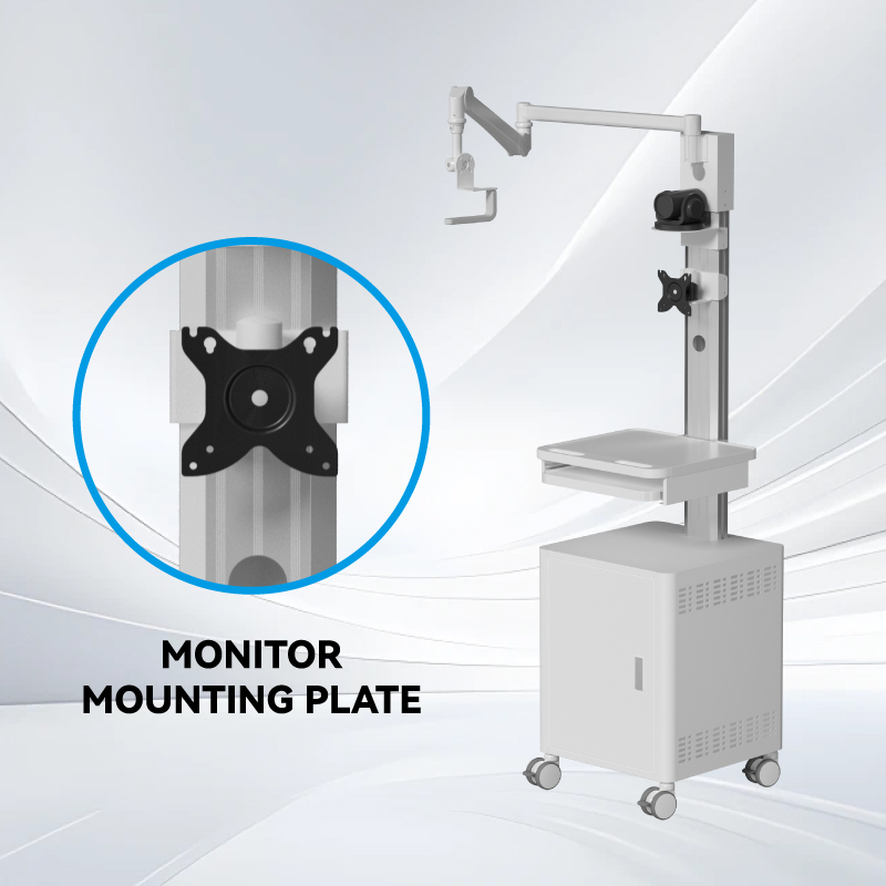 Engineered with a standard VESA 75×75mm and 100×100mm compatible monitor mounting plate, this medical cart delivers secure, tool-free installation for nearly all medical monitors, clinical displays, and desktop screens. The heavy-duty, rotation-ready bracket supports full-angle adjustment for optimal viewing, delivering ergonomic positioning during patient monitoring, dental scanning, and telemedicine consultations, while its robust construction ensures long-term stability for your display equipment.