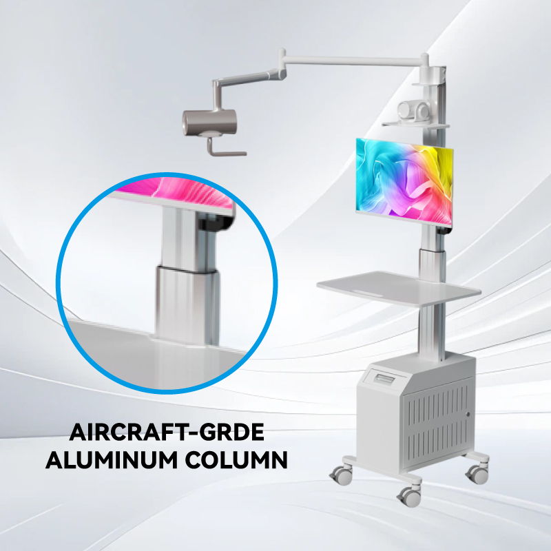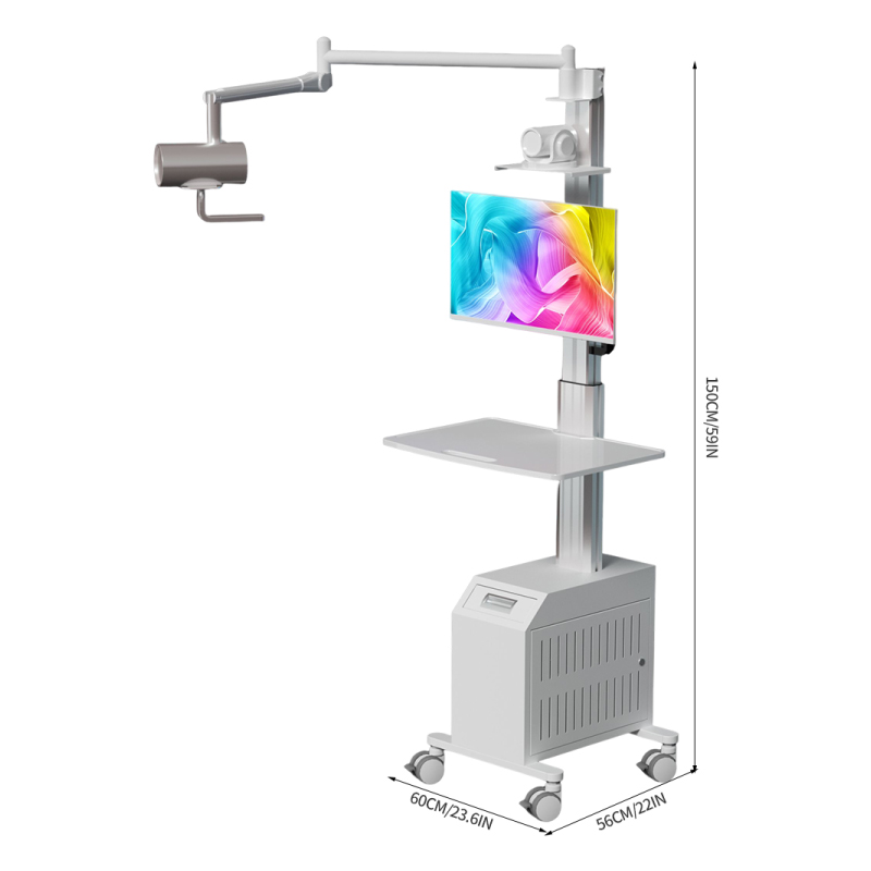 空気圧アームを備え、自由な移動と全方向への回転が可能で、口腔内スキャナー ホルダーを備えた、高さ調節可能な医療用カートです。