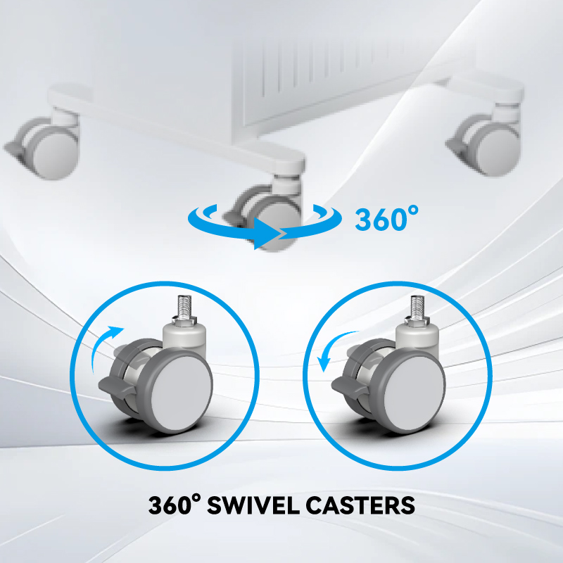 Likaymoのノートパソコンカートは、直径3インチの360°回転式ホイールを4つ備え、足踏みブレーキも備えているため、スムーズな移動と確実な位置決めが可能です。大きなホイールは、敷居やカーペットの段差も楽に乗り越え、クリニック、病院、サロンなど、様々な床材で楽に移動できます。頑丈なフレームと組み合わせることで、使用中も安定した状態を保ち、静止時にはロック付きホイールがしっかりと固定します。