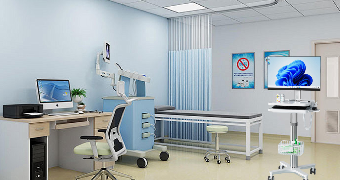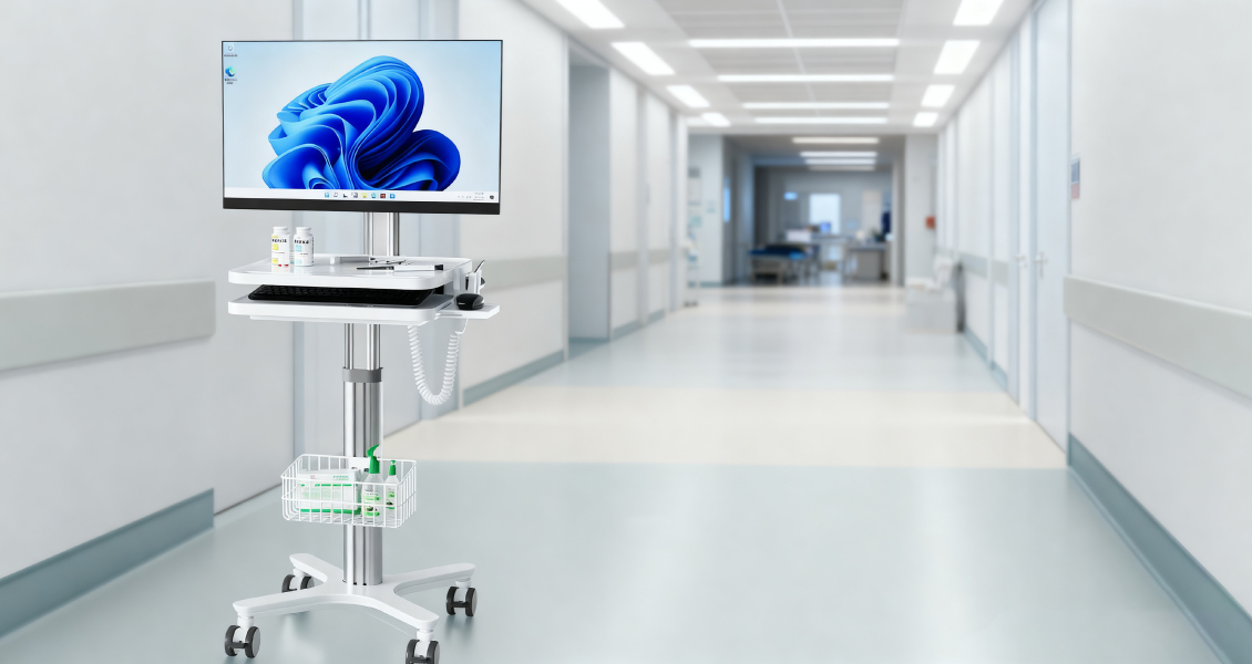 この医療カートは、高さ調節可能な支柱を備え、リアルタイムの患者データモニタリングを可能にするデジタルディスプレイを搭載しています。スライド式のキーボードトレイと、臨床現場での移動を容易にするロック付きキャスターを備えた頑丈な移動ベースを備えた、洗練されたデザインです。