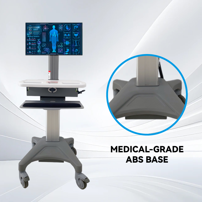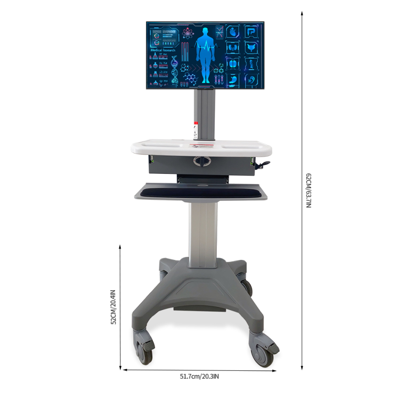 この医療カートは、高さ調節可能な支柱を備え、リアルタイムの患者データモニタリングを可能にするデジタルディスプレイを搭載しています。スライド式のキーボードトレイと、臨床現場での移動を容易にするロック付きキャスターを備えた頑丈な移動ベースを備えた、洗練されたデザインです。